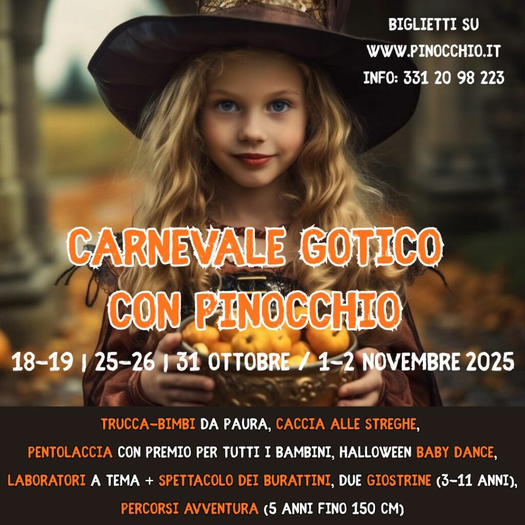 Torna la 5° edizione del Carnevale Gotico con Pinocchio, halloween per bambini al Parco di Pinocchio a Collodi (Pescia-Pistoia), nei weekend del 18-19 e del 25-26 ottobre, il 31 ottobre nel pomeriggio e sabato 1 e domenica 2 novembre.