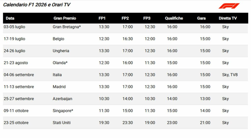 *Weekend di gara che seguiranno il format Sprint con una sessione di prove libere al venerdì, le Qualifiche valide per la Sprint al venerdì, la Sprint sabato mattina, le Qualifiche del GP sabato pomeriggio con la domenica come sempre dedicata al Gran Premio.